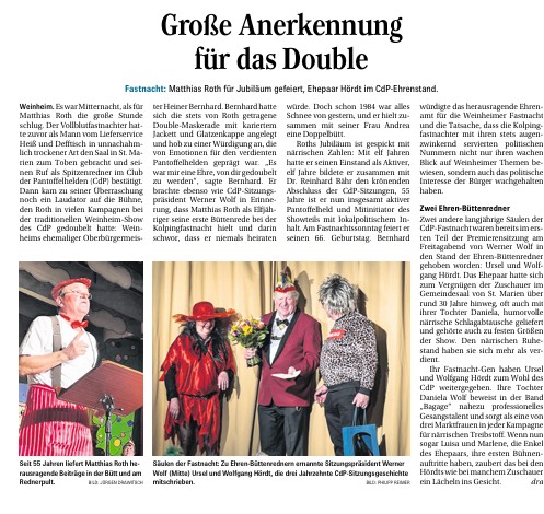 In einem feierlich ganz in weiß geschmückten Saal genossen die Anwesenden die kulinarischen und karnevalistischen Darbietungen. Die künstlerische Gestaltung des Abends übernahm der CdP Ehrenbüttenredner Dr. Reinhard Bähr. Unterhaltsam und kurzweilig spannte er einen Bogen von den Gründerjahren der Narrenschaft bis in das aktuelle Jubiläumsjahr; gespickt mit historischen Details, lustigen Anekdoten aus allen Jahrzehnten sowie exemplarischen Auszügen aus Büttenhighlights verschiedenster Akteure. Beginnend mit der Figur des Weinheimer Studenten arbeitete Reinhard Bähr sich dabei in gewohnter Manier durch unterschiedliche Musik- und Kleidungsstile. Die musikalische Begleitung übernahm Peter Christ, der als Musiker und Tuschgeber die Fasnacht Sitzungen seit vielen Jahren prägt und dem CdP in fester Freundschaft verbunden ist. Im zweiten Teil der Darbietung schließlich gaben Dr. Reinhard Bähr und Matthias Roth ein Witze Potpourri aus historischen Zeiten zum Besten und stimmten schließlich mit den Audi Quattro Kollegen Ina Kaufmann und Hansjörg Korward zu einem Jubiläumslied an.